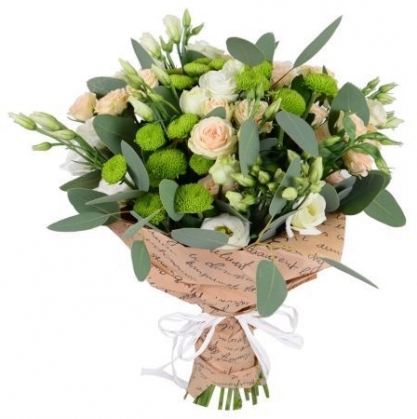 Букет из эустомы, кустовой розы, хризантемы "филин грин" и эвкалипта в стильной крафтовой упаковке