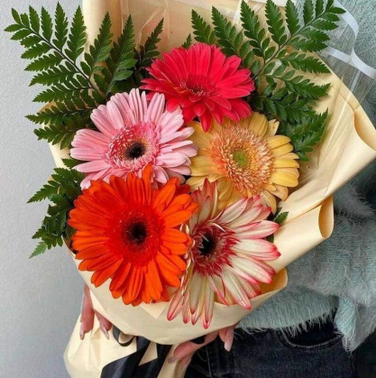 Разноцветные герберы с папоротником