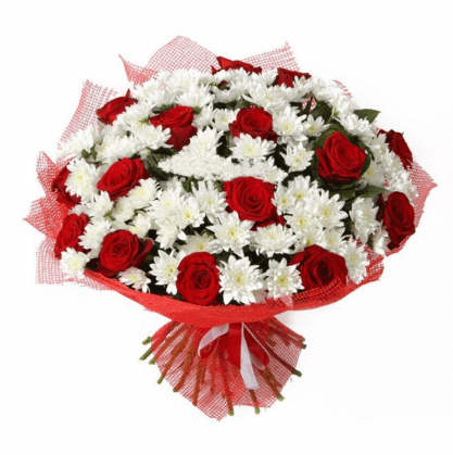 Пышный букет из красных роз и белых кустовых хризантем станет незабываемым подарком для любимой девушки.