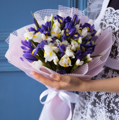 Букет из синих и белоснежных ирисов. Отлично подойдет на любые школьные праздники.