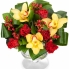 Букет из шикарной желтой орхидеи, эквадорских красных роз. Особый шарм букету добавляют красные ягодки - гиперикум.
