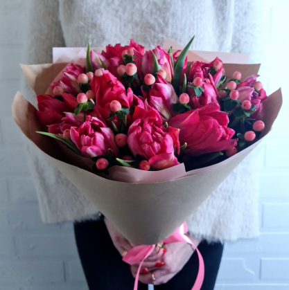 Яркие и изящные пионовидные тюльпаны розового цвета. В букет добавлены светло-розовые ягодки (гиперикум).