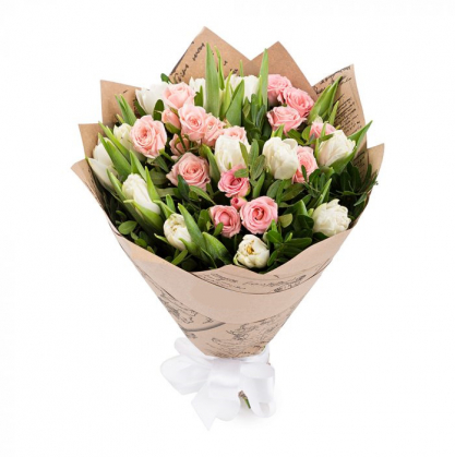 Стильный букет розовых кустовых роз и белых тюльпанов.