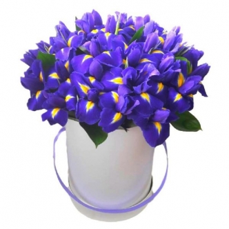 - Ирисы в коробке или корзине: Практичный и стильный вариант, который не требует вазы и дольше сохраняет свежесть.