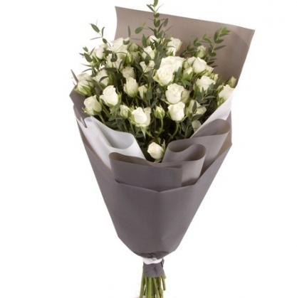Букет из кустовых роз белого цвета с добавлением эвкалипта. Возможные сорта кустовых роз: White Kristmas, Schneewittchen, Mount Shasta.