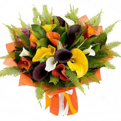Очень яркий, и в тоже время нежный, букет из разноцветных калл с добавлением зелени (амбреллы и салала). Доступен в трех вариантах под ваш бюджет.