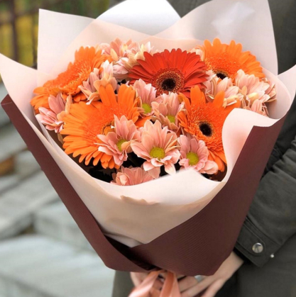 Букет из гербер и кустовых хризантем в стильной матовой упаковке