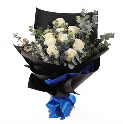 Букет состоящий из роз с добавлением эвкалипта, в стильной и красивой упаковке