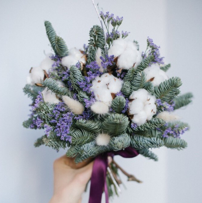 Небольшой букетик из веток нобилиса, хлопка, лимониума и лагуруса.
