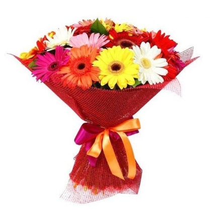 Яркий букет из разноцветных гербер в красивой упаковке.
