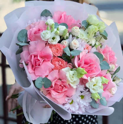 Вывернутые розы Pink Floyd (Эквадор) добавляют особый интерес к букету, а эустома своими изящными и легкими листьями передает еще одну ноту зелени и натурализма, создав баланс и динамику.