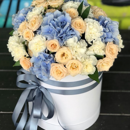 Шляпная коробка премиум класса. В состав входят гортензии, диантусы и кустовые розы, зелень.