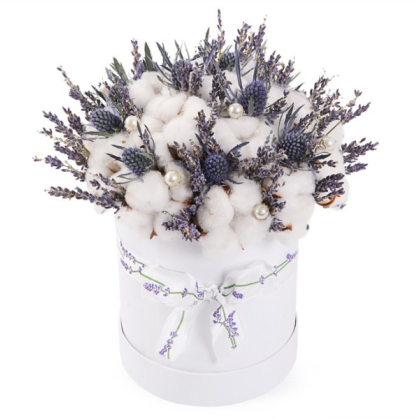 Очень красивая композиция из лаванды, хлопка и питтоспорума в шляпной коробке.
