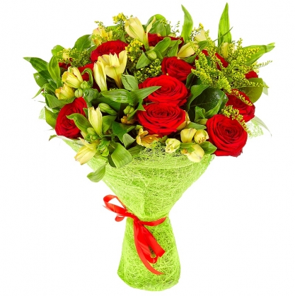 Букет из роз, альстромерий и солидаго.