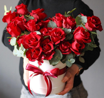 Коробка с красными розами и эвкалиптом