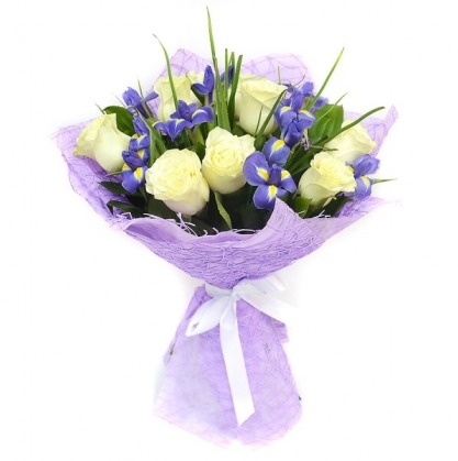 Композиция из белых роз и ирисов