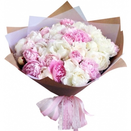 Букет из пионов с раскрывшимися бутонами. Цвет: белый и розовый. Упаковка: крафт.