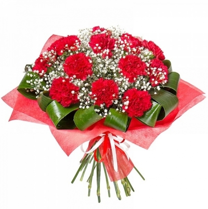 Букет из гвоздики с добавлением гипсофилы и аспидистры