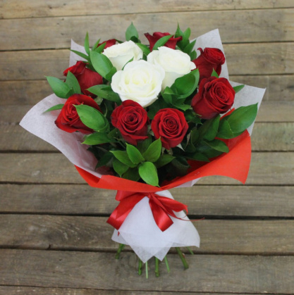 Классический букет из красных роз, по середине белые с добавлением рускуса (зелени) и в упаковке. Букет представлен в трех вариантах: классический (11 роз), стандарт (15 шт.) и VIP (19 шт.).