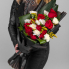 Букет в траурном стиле, состоящий из красных роз и белых гвоздик. Ддя придания контраста добавлено солидаго. Упаковка - темная матовая пленка.