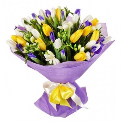 Букет "Три желания" из тюльпанов, ирисов и фрезии | Купить в Красногорске